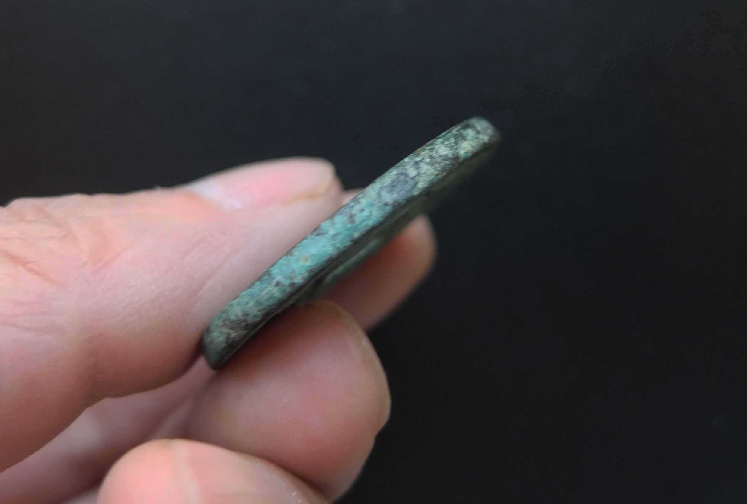 再察锈相。不难看出,本品生坑锈相,钱体为淡蓝色锈缚裹,亦可见土垢附着,愚未曾刻意清理,基本保留出土原貌。察其锈色,分布深浅相间凸显自然,老锈皮壳,覆盖有层,坚硬不糟。薄锈之处,可见包浆自然熟厚,老道踏实。识其材质,青铜质地,铜色熟旧,纯真无邪。毫无疑问,辩锈识浆,本品锈色昭然一派自然天成之相,其门不叩而开矣。
