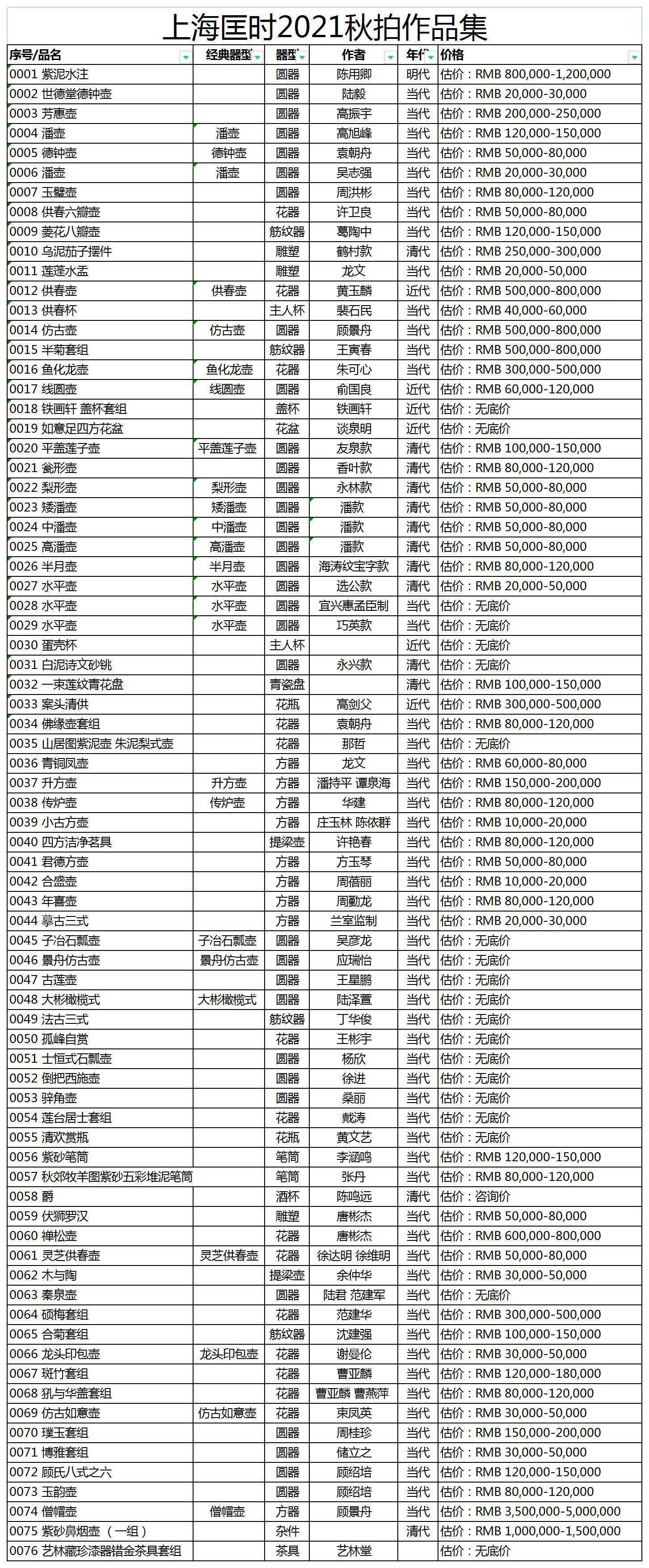 时间回到上海匡时2021秋拍于12月29日晚间在上海大剧院八楼,共六个专场,一千两百余件艺术佳作,紫砂拍卖专场让人记忆深刻的拍品,明、陈用卿、紫泥水注成交价:万;清、陈鸣远、爵、成交价:RMB1909......