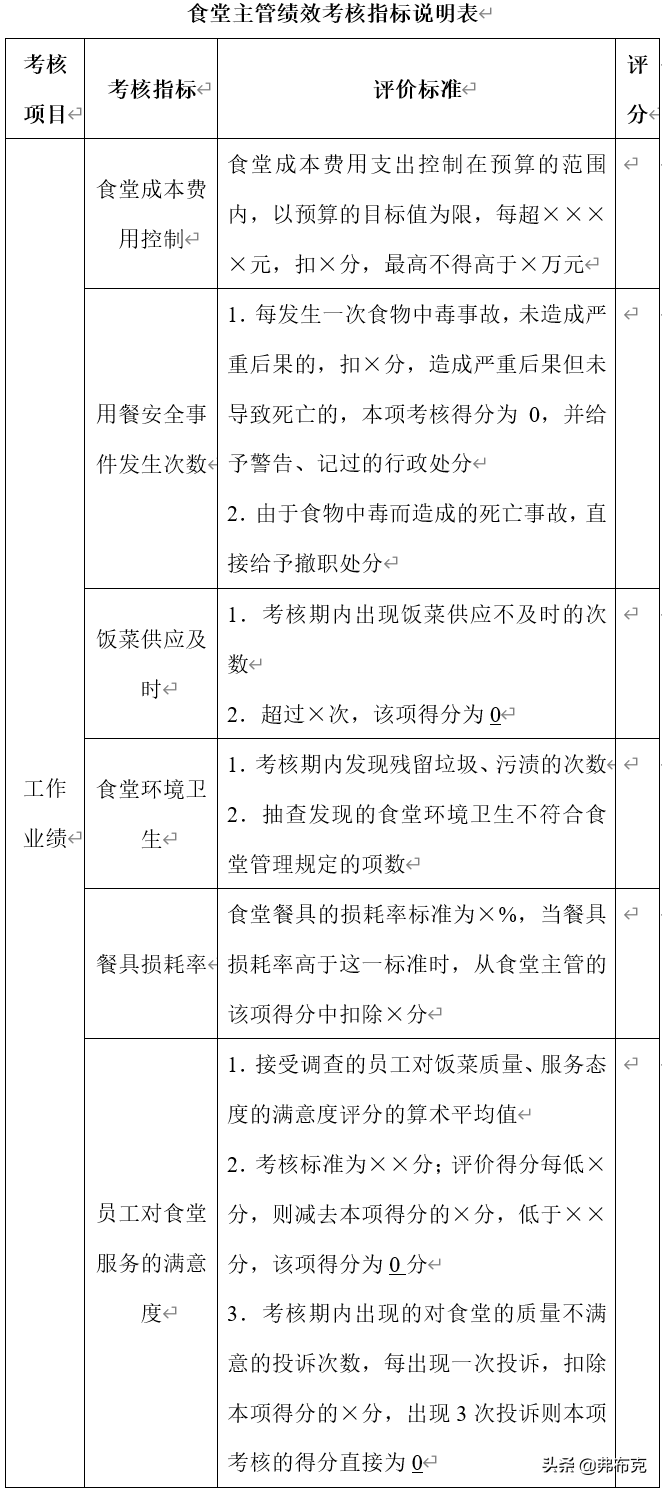 (1)行政部经理组织相关人员对食堂主管,根据员工实际工作表现,对照《食堂主管绩效考核表》进行评估,并将结果汇总上交人力资源部。