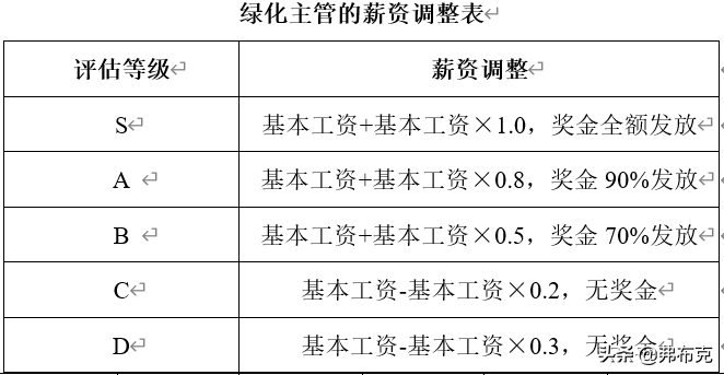 根据食堂主管的年度考核结实施不同的薪资调整办法,下表为食堂主管的薪资调整办法。