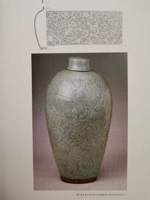越窑五代北宋期间的划花镂刻印花都出现缠枝纹题材,“五代的划花在继承晚唐风格的同时出现缠枝纹、朵花纹、波浪纹等”。耀州窑五代时期青釉划花工艺更是代表了耀州窑步入成熟创新时期。“口外壁及颈部划卷草纹,肩部划莲瓣纹,腹部划缠枝牡丹纹,肩腹相交处以弦纹相间”。