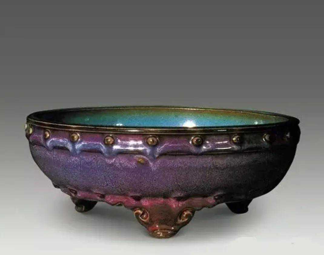 钧瓷的釉色经历了从早期烧造以天蓝色为主、多色交融,到纯净天青色的钧瓷和偶然得到夹杂紫红斑的钧瓷,再到刻意烧造多种纯色钧瓷的过程。