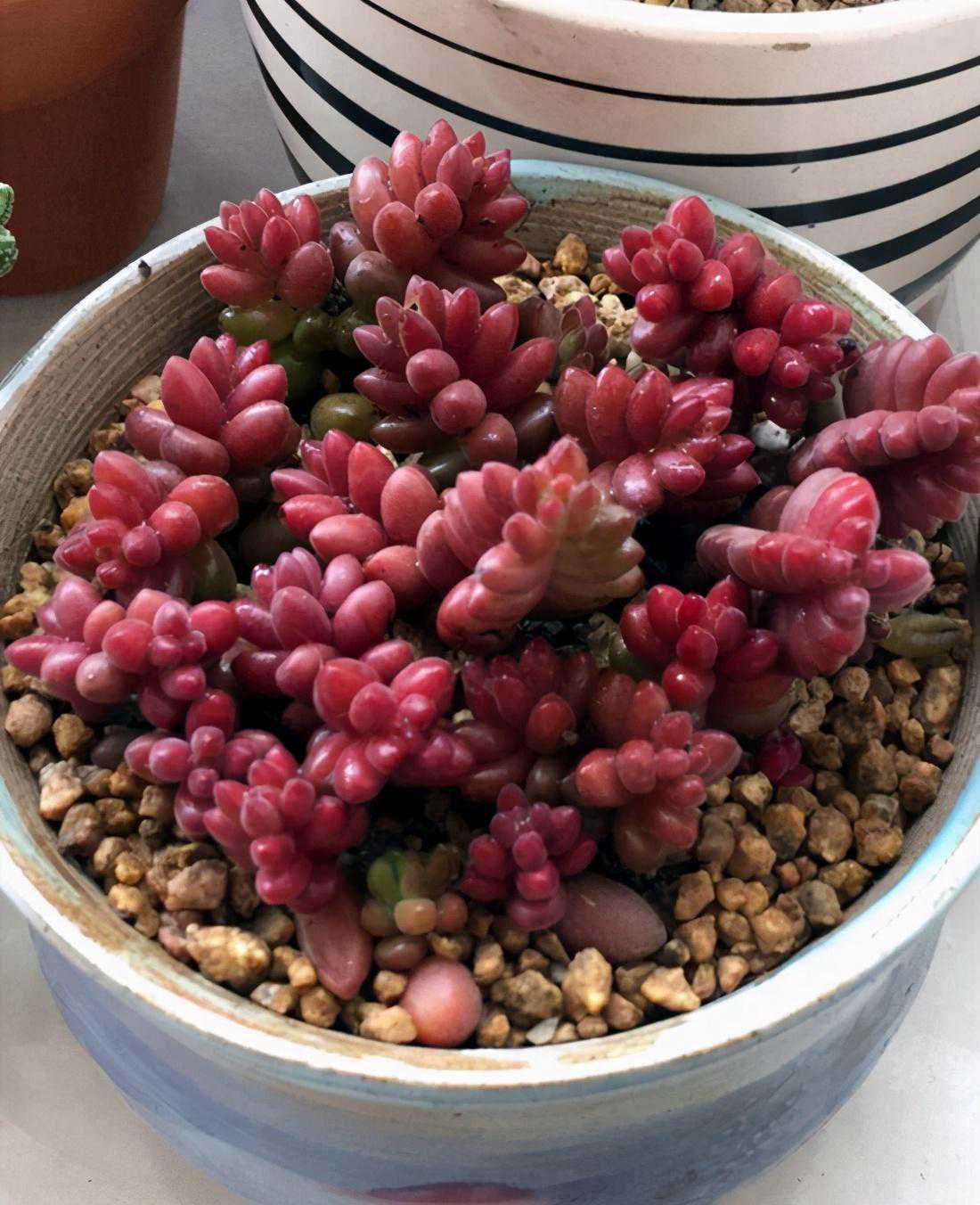 又名耳坠草,实为人工杂交种,呈扁椭圆形的肉叶,长约1公分左右,可在充分接受阳光的照晒后,通体透红,长速快,易群生,个头小小的,很适合进行组合式盆栽。