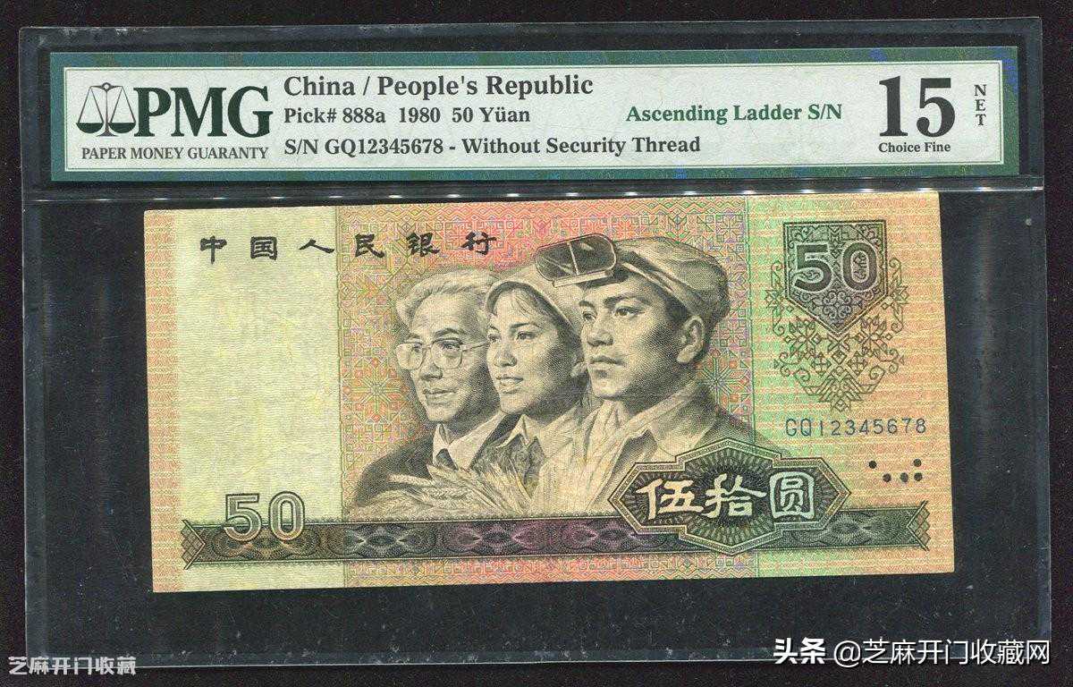 1:1980年第四套人民币伍拾圆,阶梯号12345678,票面有修补,PMG15NET,估价:RMB10000,成交价格:RMB28750