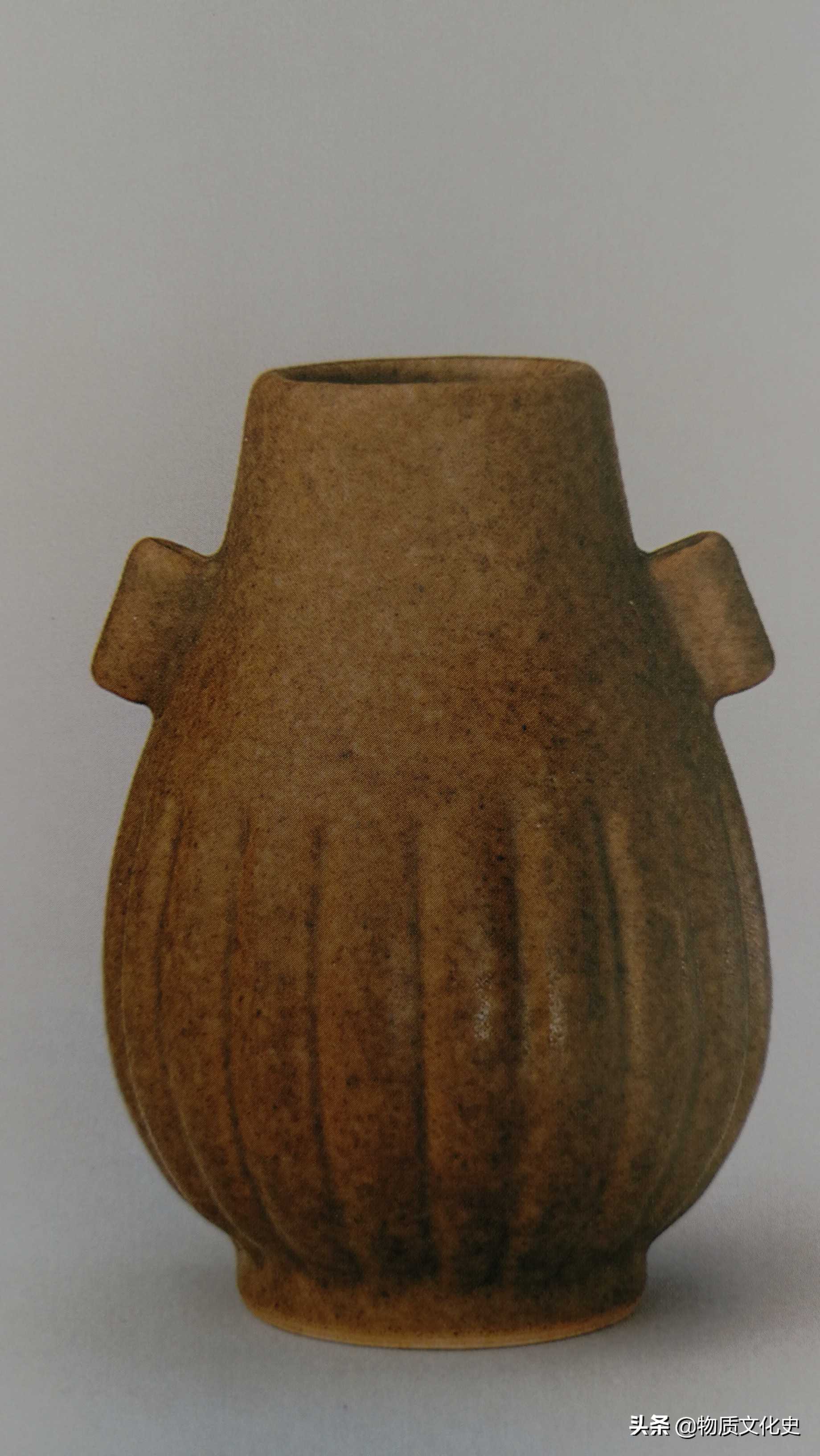 厂官釉贯耳瓶,清雍正时期所制,高9.2厘米,口径3.1厘米,足径3.9厘米。清宫旧藏。厂官釉是中国古代铁结晶釉中的重要品种,其名称始见于清代,其色有鳝鱼黄、油绿、紫金等色,直隶厂窑所烧,故名“厂官”。多缸、钵之类,釉泽苍古,配合诸窑另成一家。