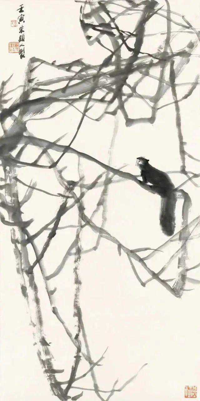走进展厅,最先看到的便是一组写意花鸟画。以“一条线”为名的展签注释,或许会让观众“一头雾水”。九十三岁高龄的画家朱颖人解释道,“潘天寿先生曾经说,‘以墨线为主的表现方法,是中国传统绘画最基本的风格特点。与书法的用线息息相关,千变万化的笔情墨趣构成了东方绘画的独特风格’。我的这一组作品是近期做的一些新的探索,通过添加新的想法与视觉感受,呈现出不同的笔墨结构。”