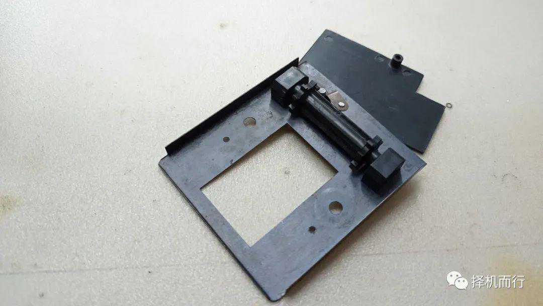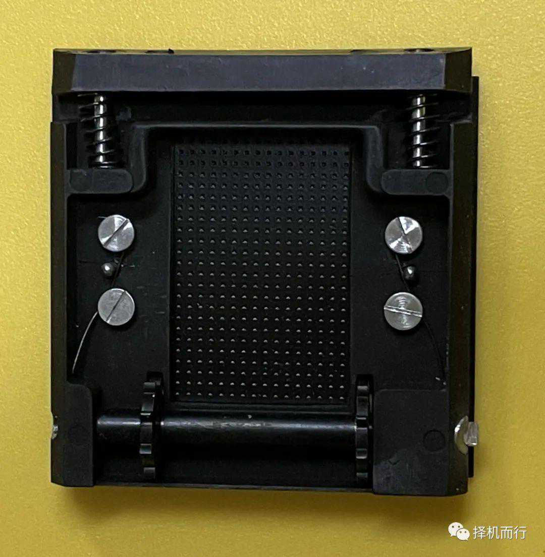 (下图为一种相对有点技术含量的计数器,使用者将附件装入4B暗仓后,需要通过听弹簧片发出的声音来判断停片,该附件看上去应该是小作坊所产,我试用过,感觉计数定位还是比较准确,但135画面框被移动到成像圈下方,对成像质量有些影响)
