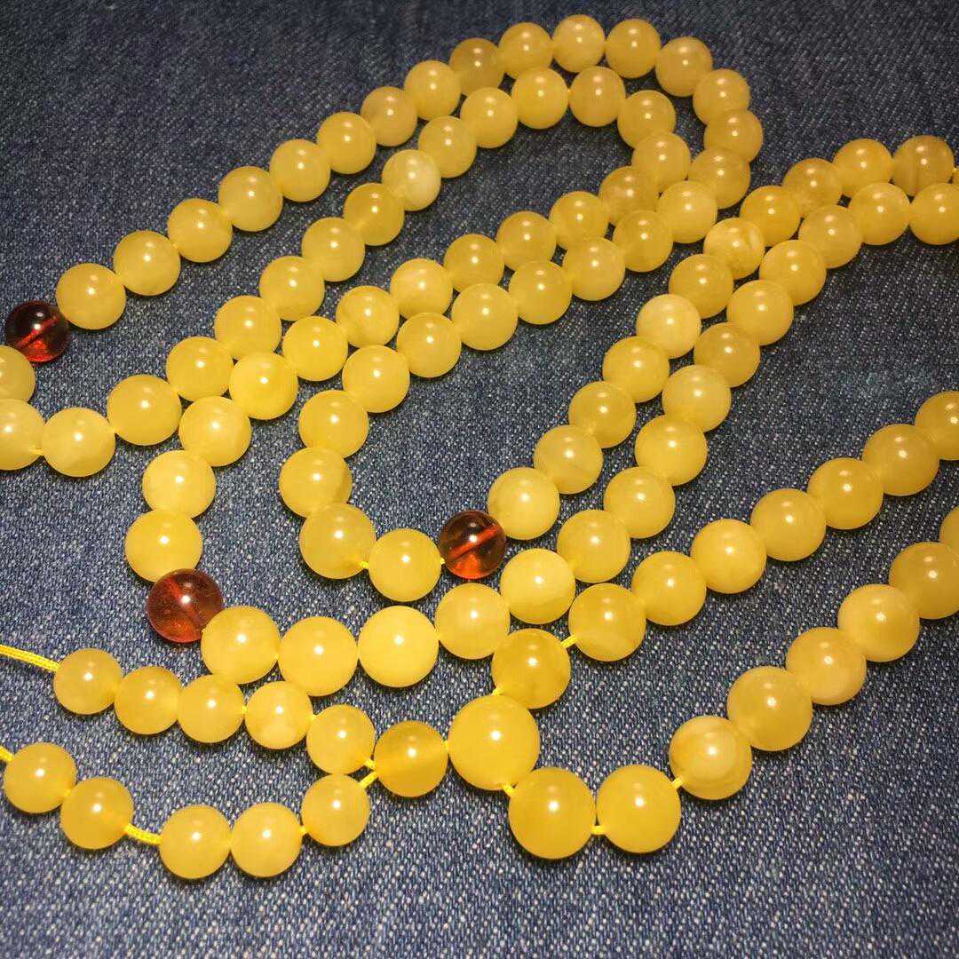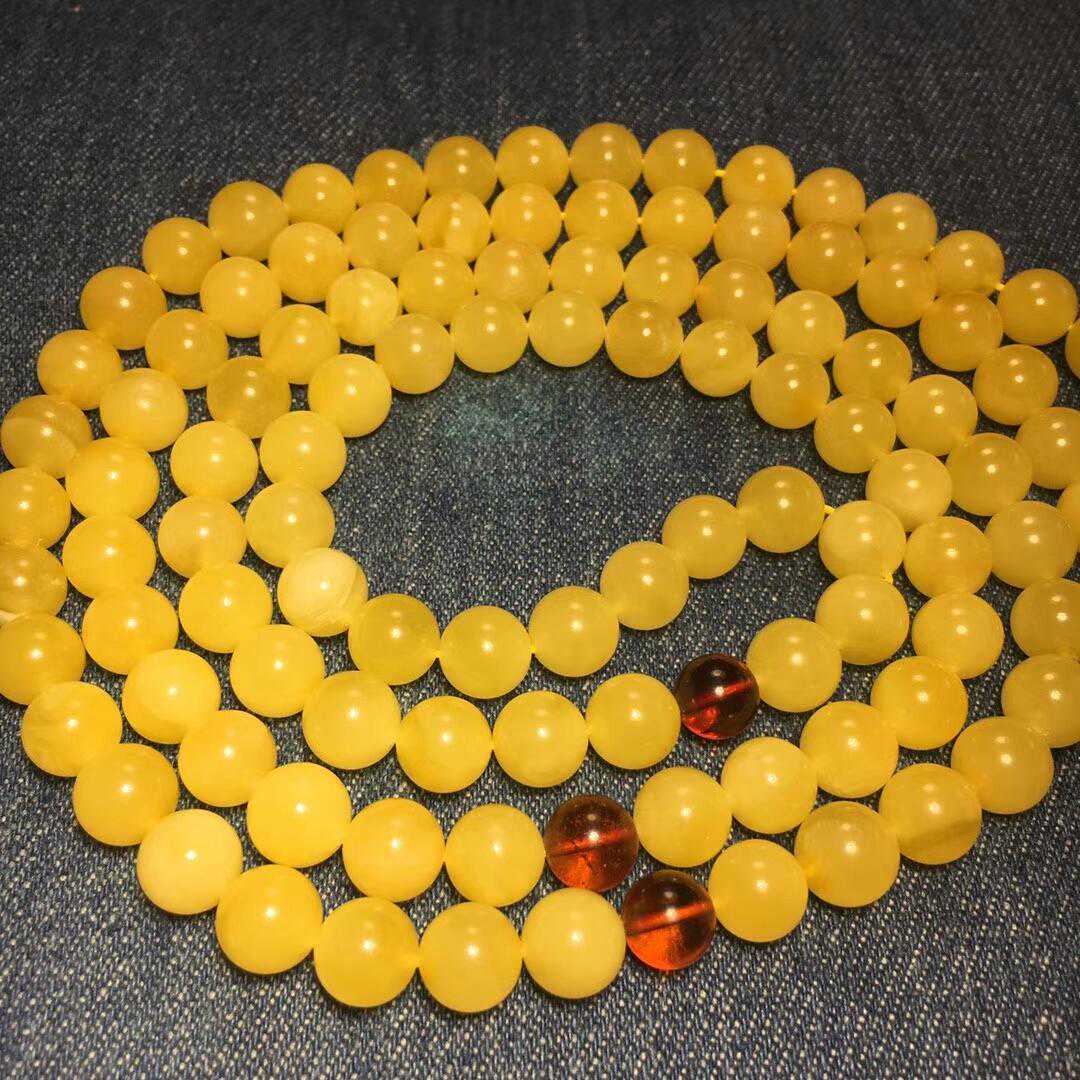 此款蜜蜡108佛珠属于基础百搭款,色泽靓丽自然,佩戴起来显的非常有气质,看着岁月在眼前变换,而蜜蜡带来更多的是那种心灵的沉静,还可以和蜜蜡吊坠一起佩戴会显得更加好看哦!