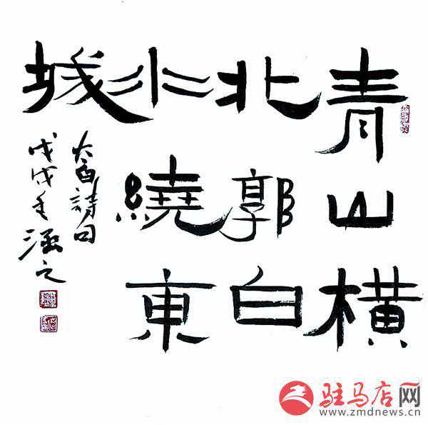 他的作品无论隶书、行草、楷书,每个字都有明确的结构意识和秩序感,每幅作品都有对比,传统中有新意,简约中蕴多变,言之有物,信手挥毫处抒情达意,不经意间完成了书写理性的严谨和内容感性的奔放自由融合,在笔墨中构建优美典雅的中国古典意蕴空间。有思考、有暗示、有隐喻、有象征,大自然的勃勃生机,世俗中不妥协的一股清流之泉充盈于臧新义的笔墨相生发当中。