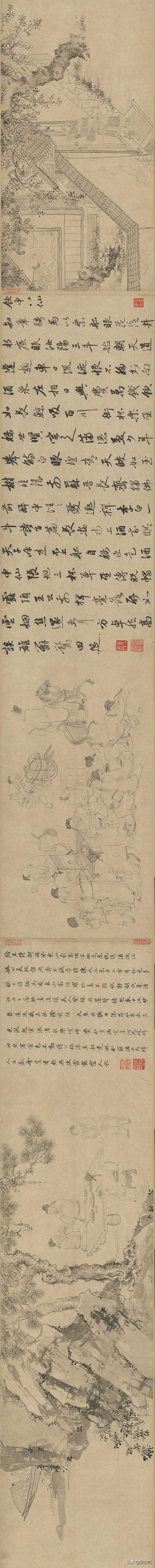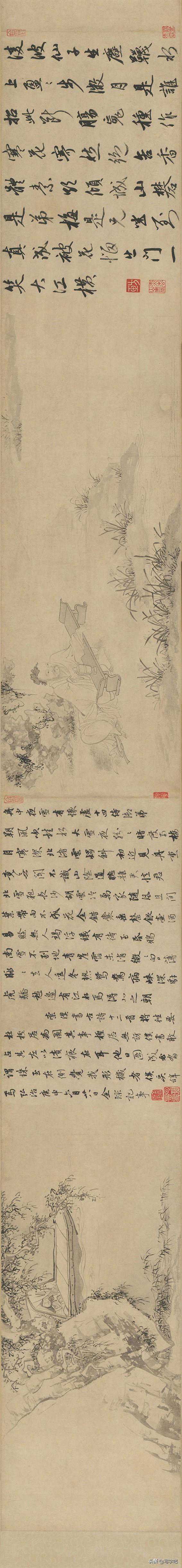 现藏于北京故宫博物院的《古贤诗意图》卷,于弘治十三年(1500)由金琮书唐宋名诗十二首,后又由杜堇按诗意补图,现存九段。