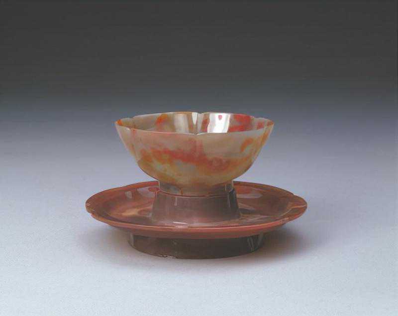 托碗花玛瑙质地,呈现白、灰、红、紫红等几种颜色。碗为六瓣葵花式,圈足。内底阴刻双竖行“乾隆年制”四字篆书款,其下另刻有“甲”字。盘亦为葵花式,中心凸起圆形碗托,内刻“甲”字,底为圆形撇口足,足内阴刻双竖行“乾隆年制”四字篆书款。