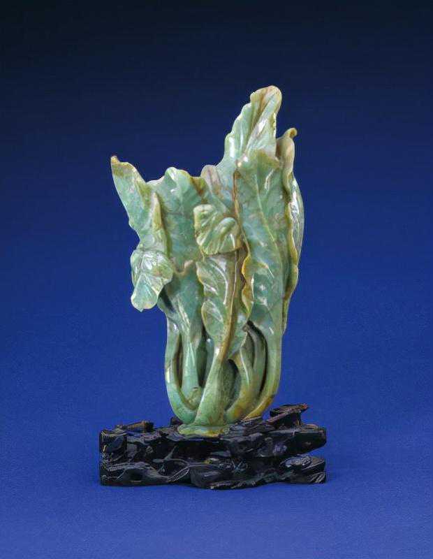 花插为翡翠质地,圆雕作一整颗白菜,菜叶碧绿,叶片肥硕,挺拔直立。中部有一椭圆形孔,以供插花。底以菜根为足,下配以镂雕山石、灵芝、竹叶纹的红木座。
