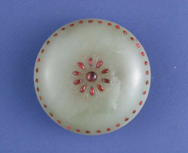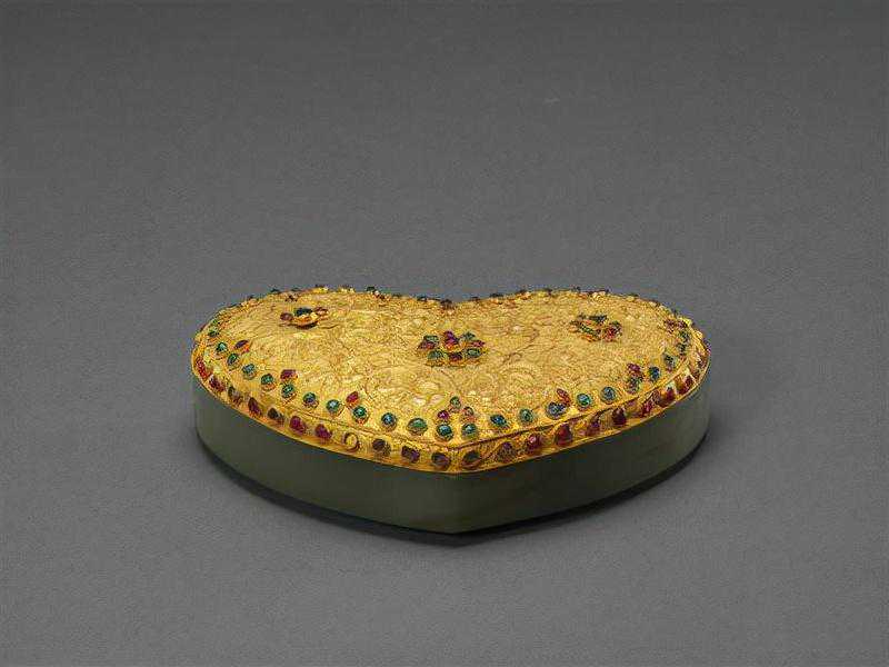 盒青玉质。桃形,薄胎,光素无纹。金盖,采用錾刻、累丝和镶嵌工艺装饰勾莲花纹,并用红绿两色宝石镶嵌。