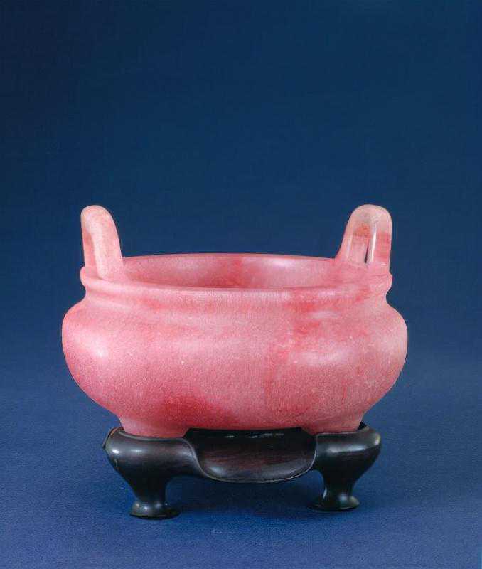 清代的玉炉很多,但用芙蓉石制作的炉却极少,这是因为做炉需要较大块的料,而芙蓉石一般裂纹很多不宜使用。中国芙蓉石的产量小,颜色与质地亦欠佳。此件芙蓉石炉颜色艳丽,用料多,虽有天然形成的冰裂纹,但已实属不易。