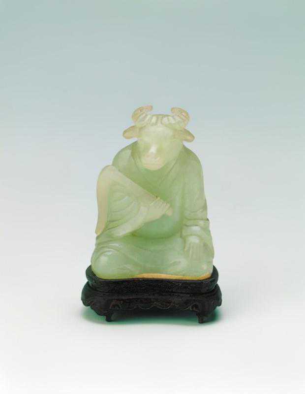青玉十二生肖,清,玉件高5.9cm,宽4cm,玉盒高5.7cm,径10.4cm。