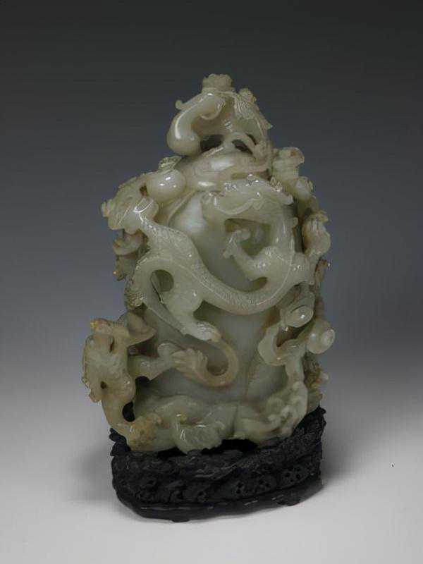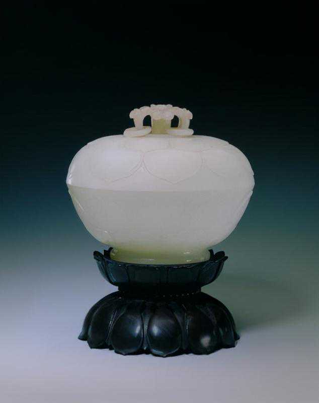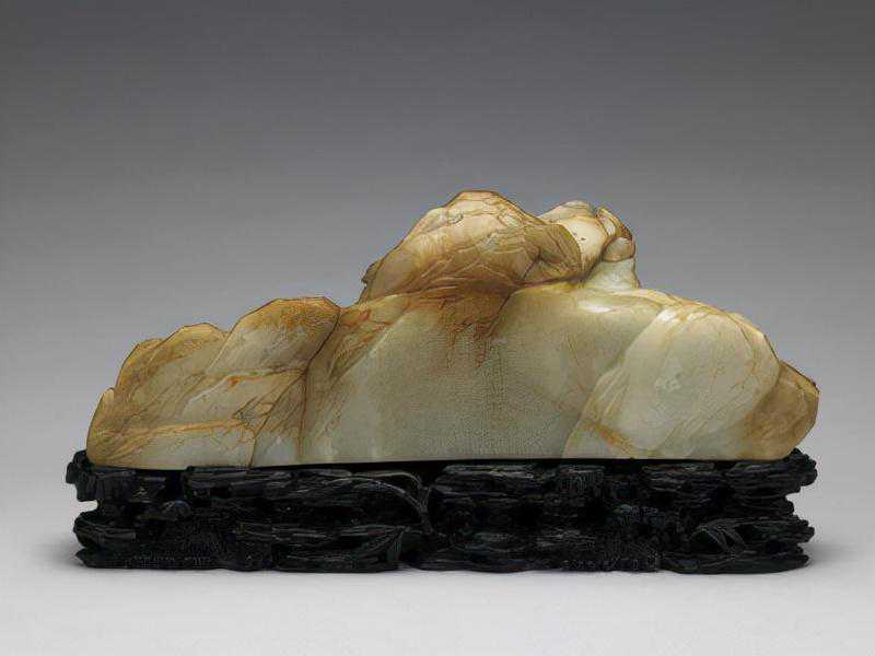 。此物选材精良,造型丰润鲜活,与深色器座相配更显出了庄重大气的艺术效果,为清中期玉器的代表作。