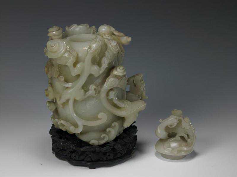 青玉龙凤尊,清,口径18.2×7cm,足径16.8×6.5cm,高17.9cm。