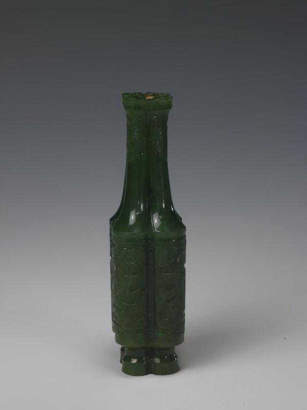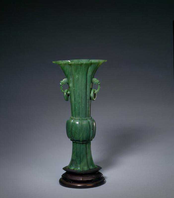 碧玉双兽耳海棠式花觚,清,口径14.1×8.2cm,足径8.2×6.2cm,高29cm。