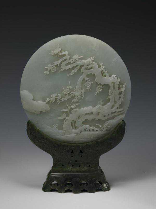 青玉梅花图屏,清,径19.3cm,厚1.3cm。
