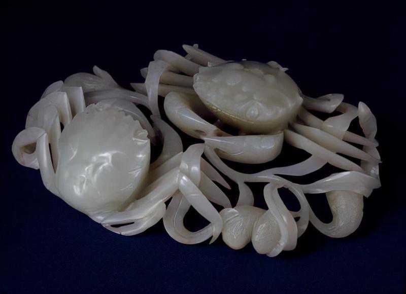 以白玉圆雕相对的二蟹,双鳌各夹持芦花、芦穗一枝。背甲玉色略青。