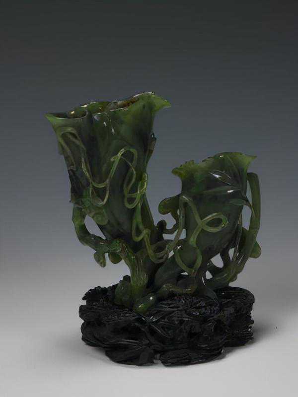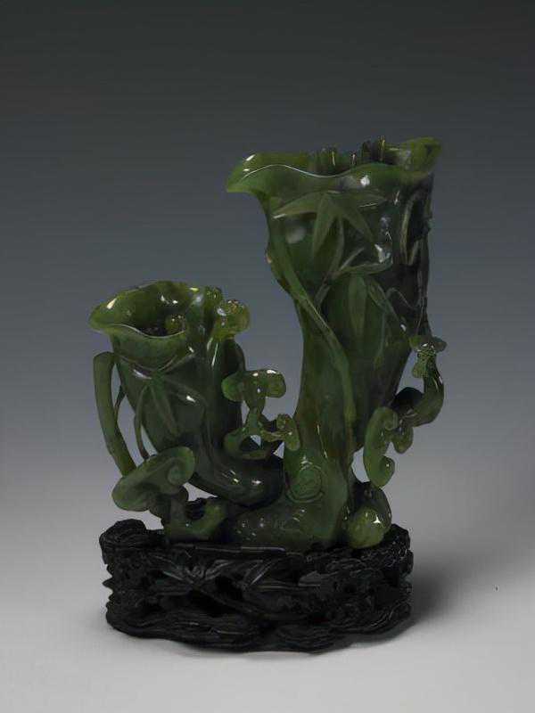 碧玉灵芝花插,清,口径2.6×7.4,3.1×5.2cm,高12.6cm。