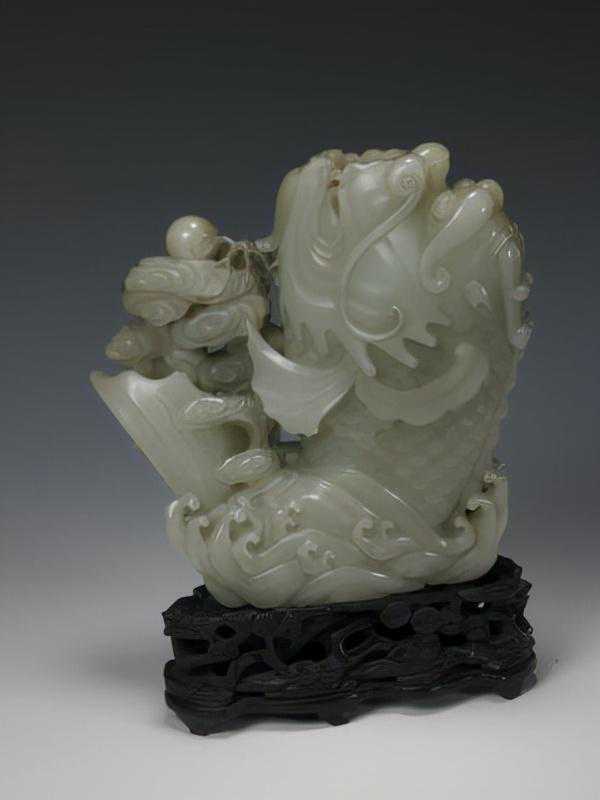 青玉衔莲水座大鱼,清,长24.5cm,高13.5cm。