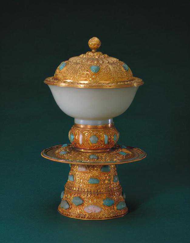 这是一件藏传佛教中常见的供碗,碗以白玉雕成,盖、座以金成造,合而为一,更显名贵。盖上有藏文咒为饰,其余部分均嵌饰松石,表现出浓厚的藏族文化的风味。