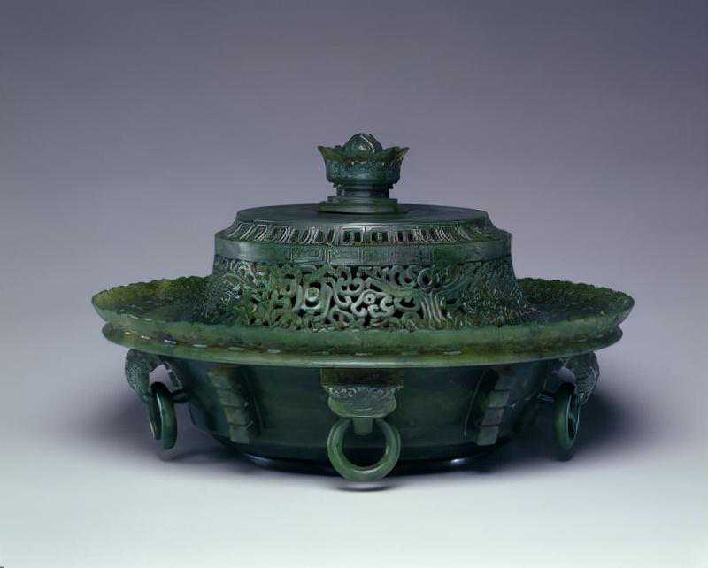 碧玉兽耳活环香熏,清,通盖高13.4cm,口径22.5cm,足径10.5cm。