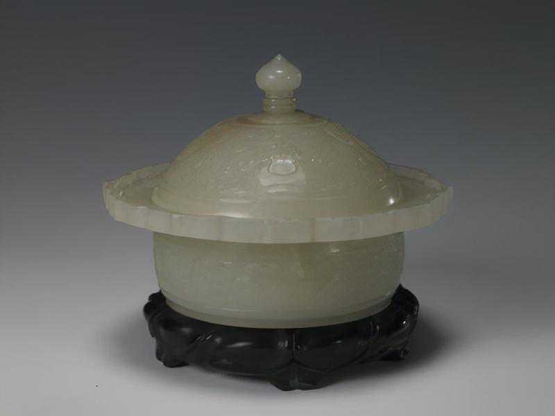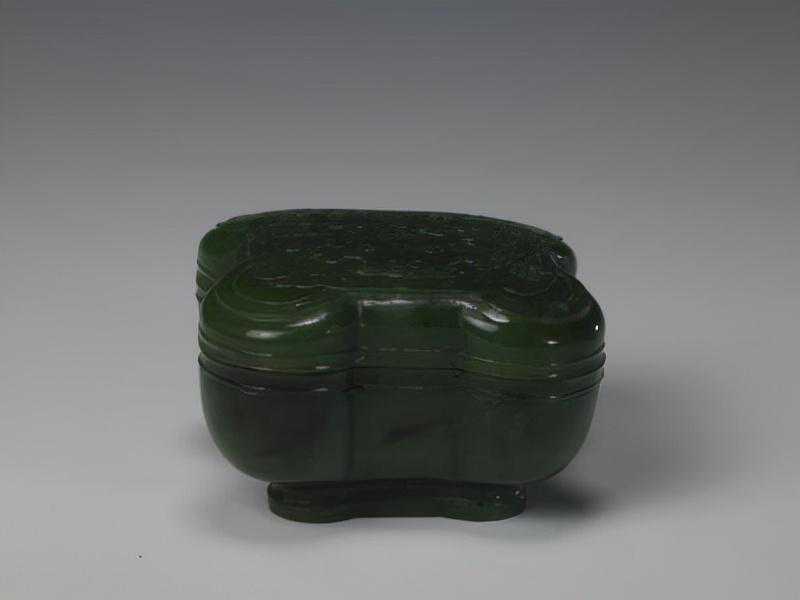 碧玉镂雕牡丹纹盒,清,通高9.1cm,最大口径20.4cm。