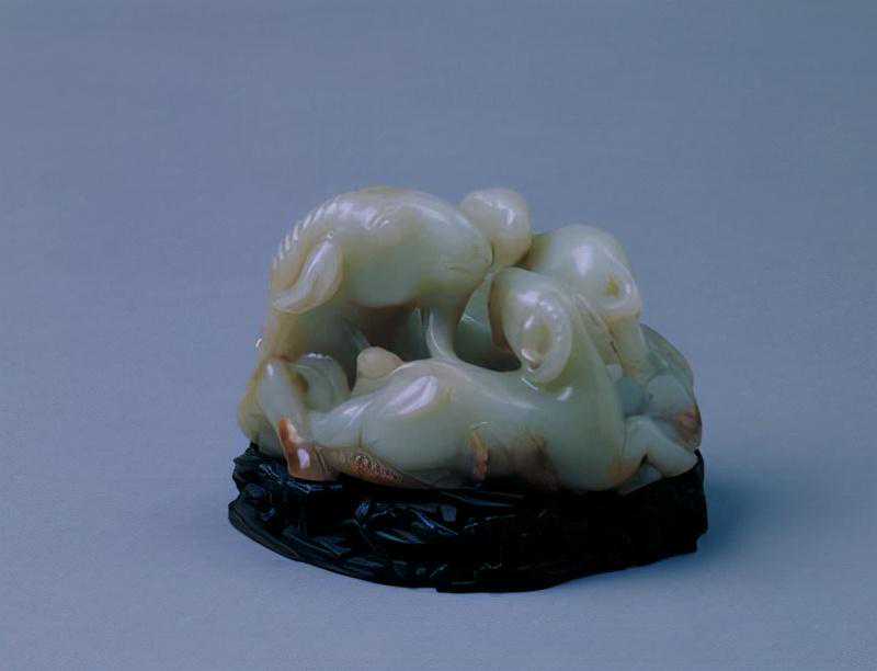 玉执壶是清代宫廷重要的陈设品,样式极多。将三只羊组合的艺术造型和纹饰图案在清代非常盛行。除了玉器,陶瓷、青铜器和绘画中往往亦以三羊作饰,俗称“三阳开泰”。古时“羊”通“阳”,据《易经》记载:“正月为泰卦,三阳生于下。”后人因“阳”、“羊”谐音,用三羊喻三阳,取其冬去春来阴消阳长,有吉亨之象,多用于岁首祝颂之辞。