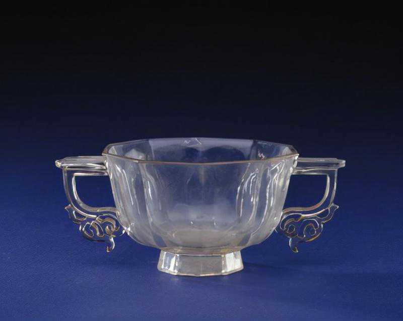 水晶双耳十角杯,清乾隆,高6cm,口径9.7cm,足径4.3cm。