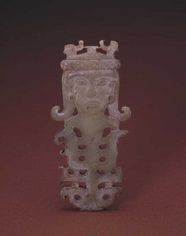据分析,作品原系嵌于柱形器的角部,3件或4件为一组,这样的柱形器可能是玉琮之类的器物。
