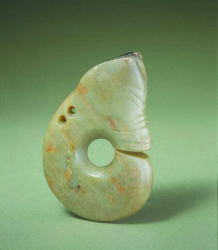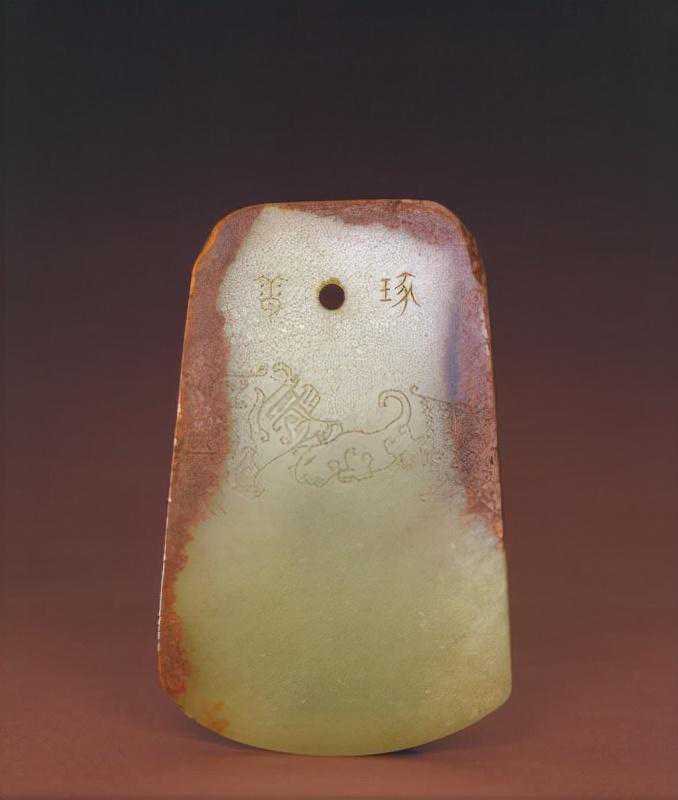 青玉十二辰斧形佩——辰,清,高8.8cm,宽7.5cm,厚0.7cm。