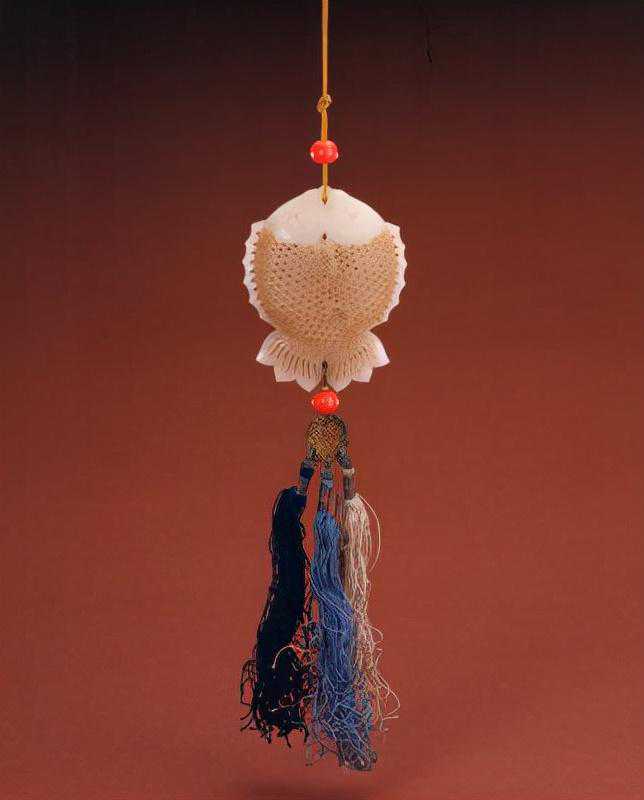 白玉镂雕双鱼式香囊,清,长7.3cm,宽5.8cm。
