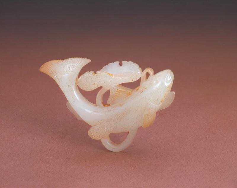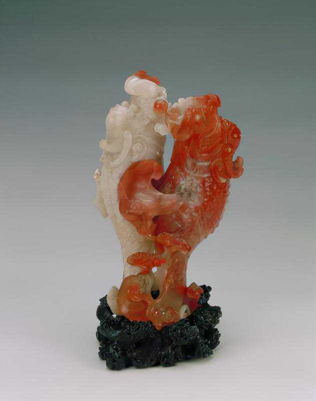 花插玛瑙质。为红白双色玛瑙,做成双鱼式,鱼口张开,空腹可实用。二鱼身尾相连,红白分明,双双呈身体向上跃起状。鱼身不仅有鳍还有双翅,口外雕火珠,表明是鱼龙。鱼尾部开叉形成器足,身侧凸雕灵芝多个。下配以紫檀红木雕海水纹座,海水浪花翻卷,两只小水螺浮在浪尖上,二鱼身置于座上,似两条刚从水中跃起的欲跳龙门的锦鲤。红鱼尾部内侧有阴刻横行四字篆书款“乾隆年制”。此为清中期玛瑙俏作的代表性作品。