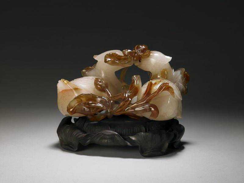 红白玛瑙蝙蝠桃树花插,清,高19.3cm,宽22cm。