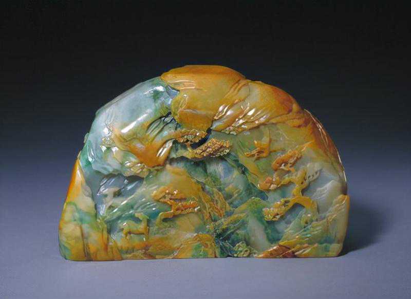 此器既有玉皮的黄色,又在翠绿中含有白色,绿白分明,黄绿相间,色彩鲜艳。全器构图合理,景物比例适当,透视感强,是非常珍贵的山形陈设品。