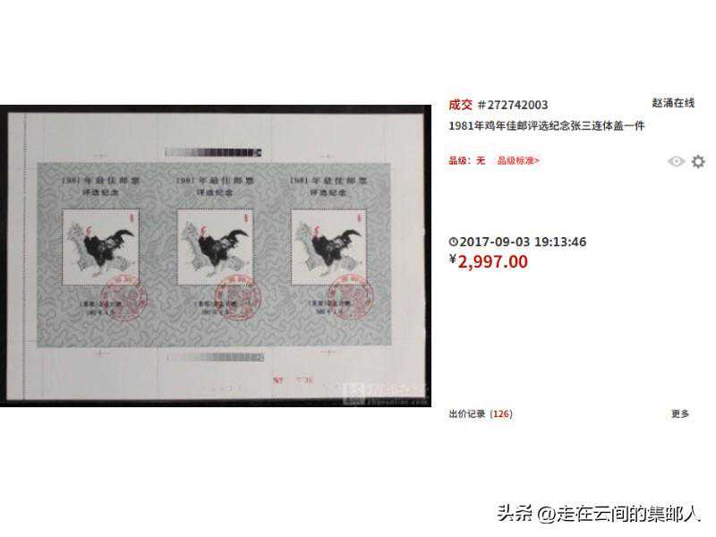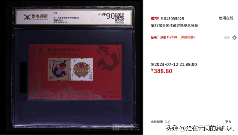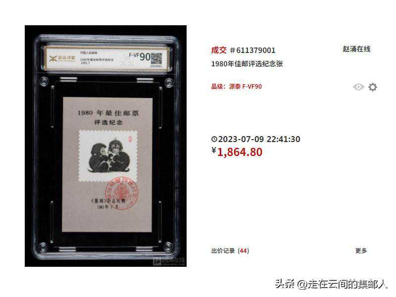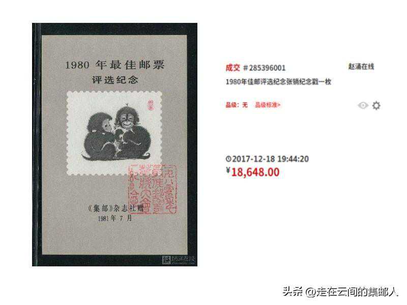 1981年发行。此次评选张主图是韩美林绘制的“双猴图(悄悄话)”,受欢迎度高,价格千元左右。带方戳的价格很高,品相好的接近两万元,是圆戳的十几倍!