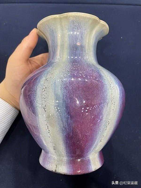 “大清道光年制”款本品花口翻沿,束颈,溜肩,圆腹及底内收,下承高圈足。通体施窑变釉,釉面晶莹润洁,红蓝晕散交融,随腹部凹棱几缕紫蓝色釉下垂,形成六条蓝色装饰带,与腹部的红釉烘托出明亮艳丽的热烈气氛,清晰自然的流散形同缕缕山泉,艳丽的颜色,变化万千的色泽,给人一种变幻莫测、扑朔迷离之感,别具情趣。外底施酱釉,中心刻“大清道光年制”六字三行篆书款。窑变釉为雍正时期创烧的仿宋代钧釉品种,《唐英瓷务年谱长编》中记载,唐英于雍正七年(1729年)三月,“派厂署幕友吴荛圃调查钧窑器釉料配制方法”,成功烧制出这一品种,并多次奉命烧造,足见皇帝对窑变釉的偏爱。