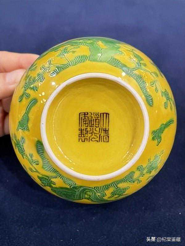 清道光仿明黄地绿彩花鸟寿桃纹墩式碗