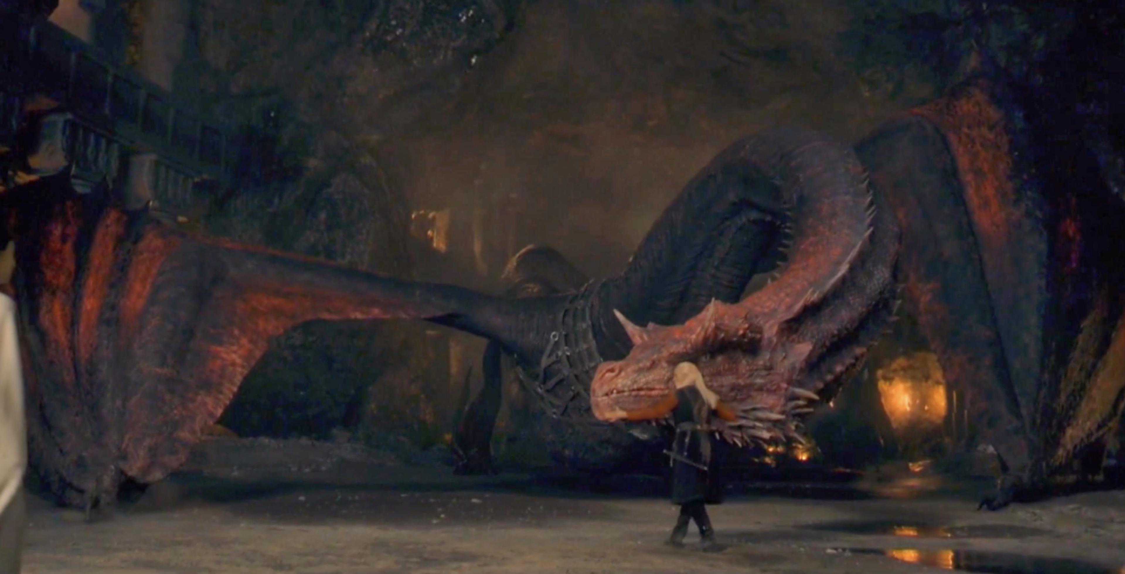 这条活了180岁的巨龙瓦格哈尔,可以称之为坦格利安家族的三大始祖龙.在征服前的52年,于龙石岛上用龙蛋孵化出来,到了龙之家族的时间线,它成了现存最大以及最年长的飞龙。它站在地上比城墙都要高,喉咙大到可以吞下一匹战马,仅仅只比它的大哥,史上最大的龙贝勒里恩小一点点。龙之家族第1集出现的硕大龙骨就是贝勒里恩,也被称之为黑死神,据说它的体型大到可以吞下猛犸象,寿命达到了200年。