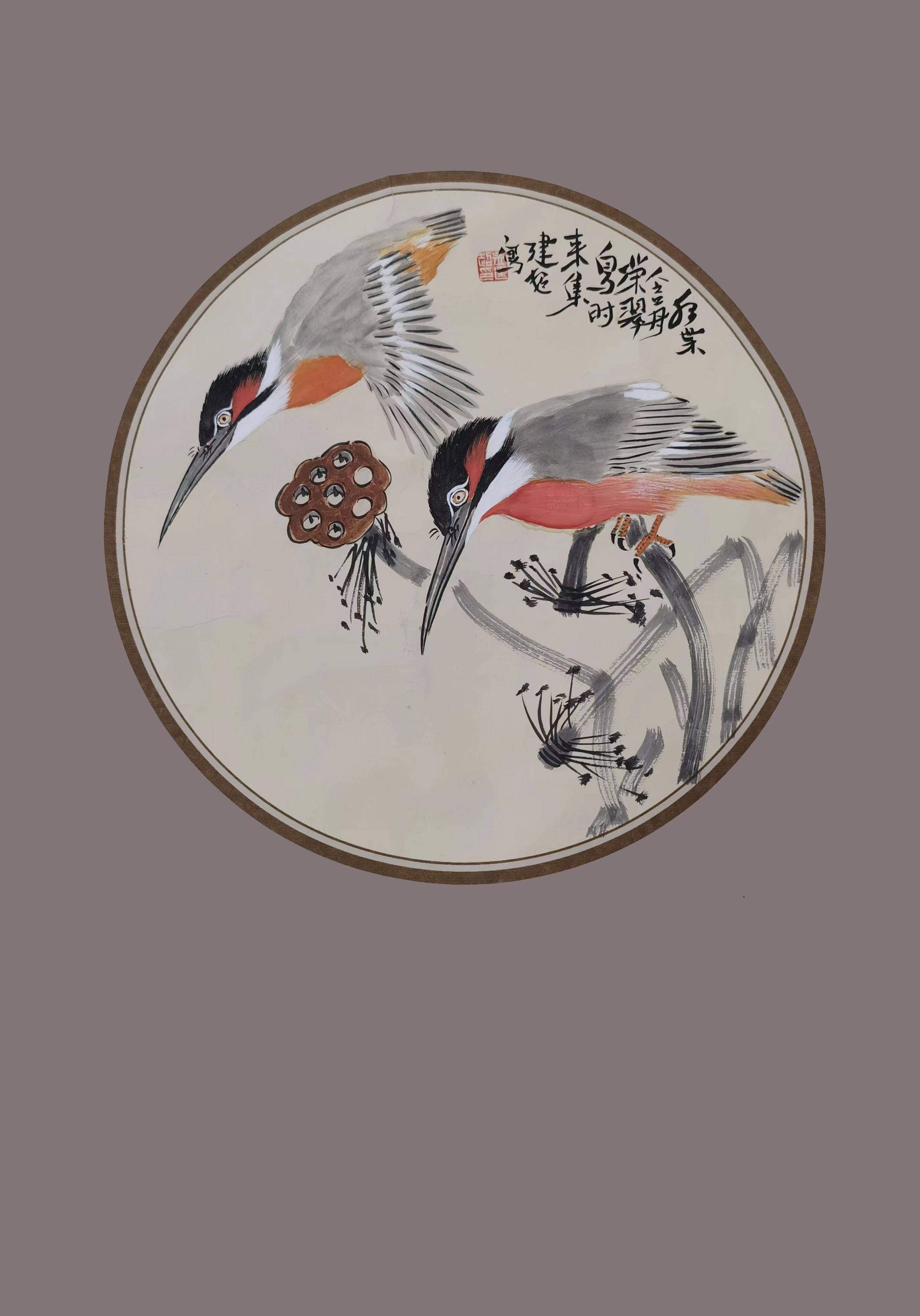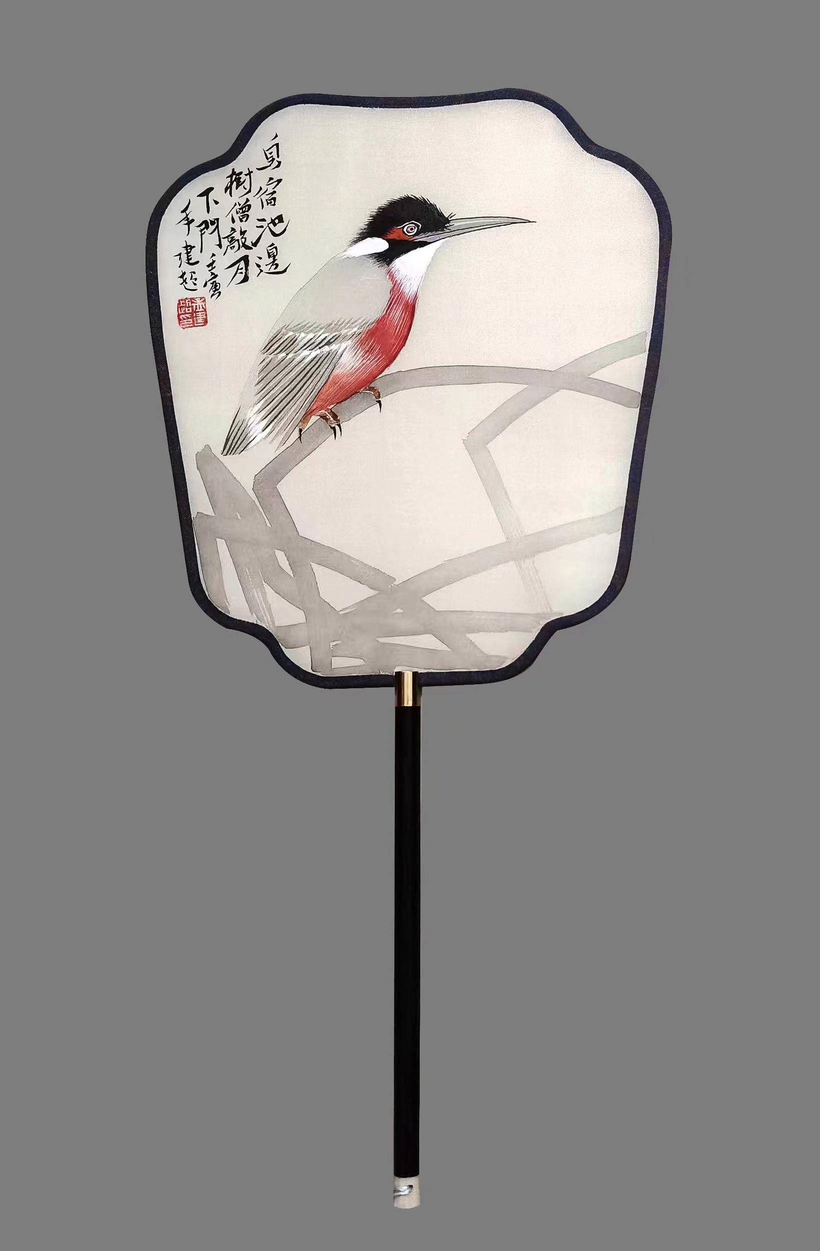 画家孟建超之团扇花鸟画既有工笔画之细致入微,又有写意画之笔墨神韵。其作以美感人、以情动人,笔墨洒脱、形神相合,融合动静、虚实相生,富有情思、充溢诗意。其所绘花草疏密有致、巧拙相间、简约天然,禽鸟羽毛蓬松、眼神灵动、意趣横生。