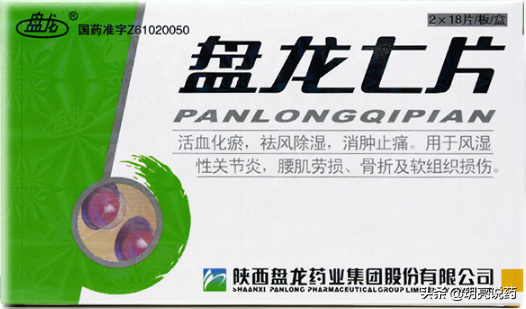 盘龙七片,具有活血化瘀,祛风除湿,消肿止痛的功效。由盘龙七、壮筋丹、五加皮、杜仲、当归、珠子参、青蛙七、过山龙、秦艽、木香、祖司麻、络石藤、川乌、白毛七、铁棒锤、草乌、老鼠七、支柱蓼、红花、没药、竹根七、缬草、伸筋草、牛膝、丹参、羊角七、八里麻、重楼、乳香组成。用于风湿性关节炎,腰肌劳损,骨折及软组织损伤。