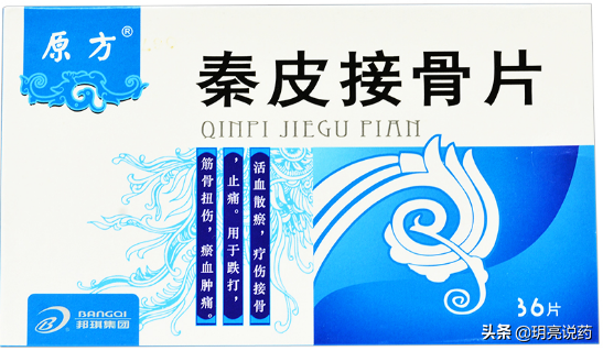 秦皮接骨片,具有活血散瘀,疗伤接骨,止痛的功效。由秦皮、川西小黄菊、龙骨、川贝母组成。用于跌打,筋骨扭伤,瘀血肿痛,对各种骨折、骨不愈合、筋骨损伤、骨关节扭伤、腰肌劳损、外伤性骨伤、颈肩腰腿痛、闪腰岔气、急慢性骨髓炎、肌筋膜炎、椎间盘突出、强直性脊柱炎等症有很好的治疗效果。