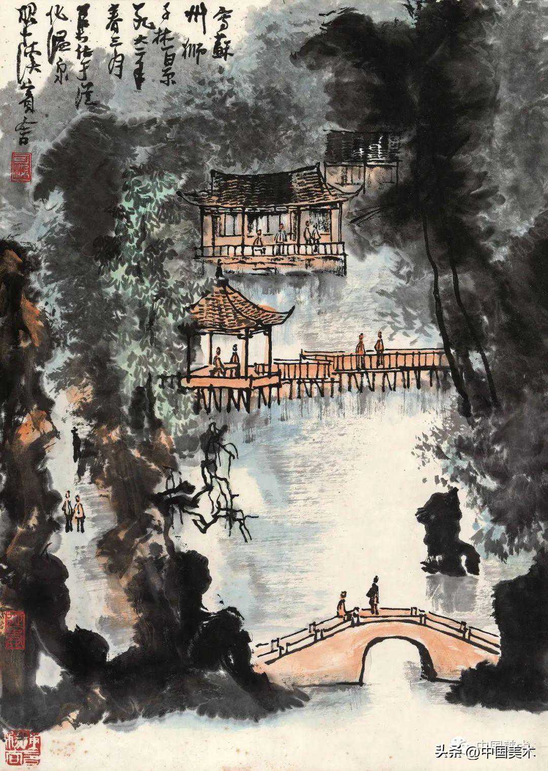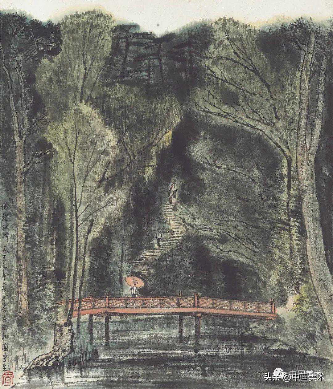 李可染桥亭听泉图