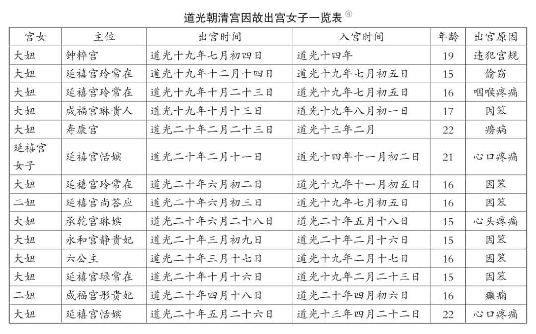 此表根据中国第一历史档案馆所藏《内务府奏案》和《内务府奏销档》整理。出自滕德永《从档案看清代宫女的因故出宫》,《沈阳故宫博物院院刊》第十七辑。