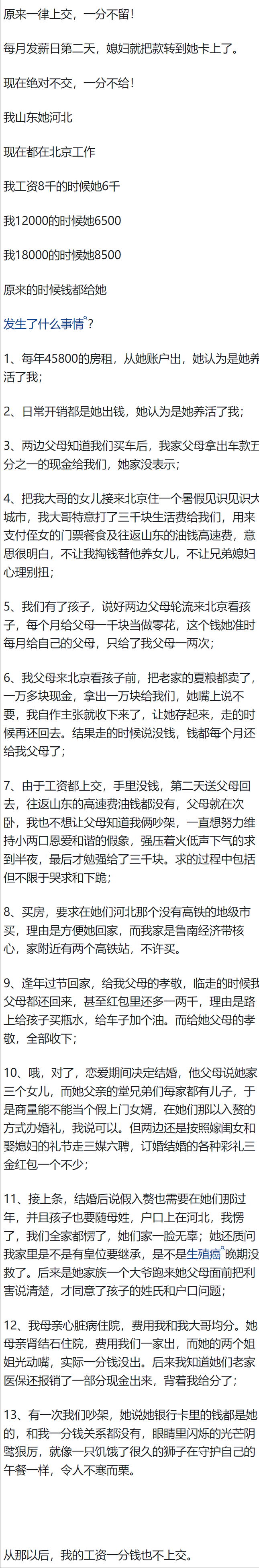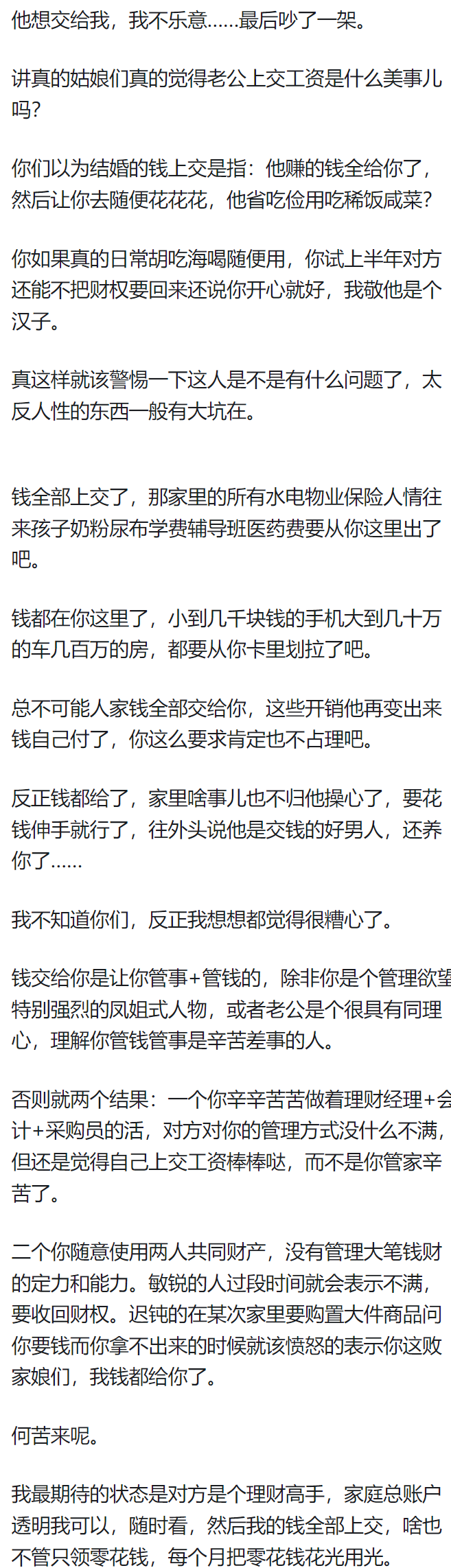 管钱这个事,说白了就是记账,支出收入列个表,每个月总结一次就行。。有啥难的?特别现在多半电子支付,自带账单,还不会像以前想不起来钱用哪里了。你这茶米油盐是从天上掉的还是路上捡的,还能查都查不到?我老公......