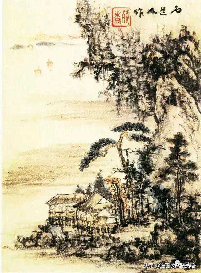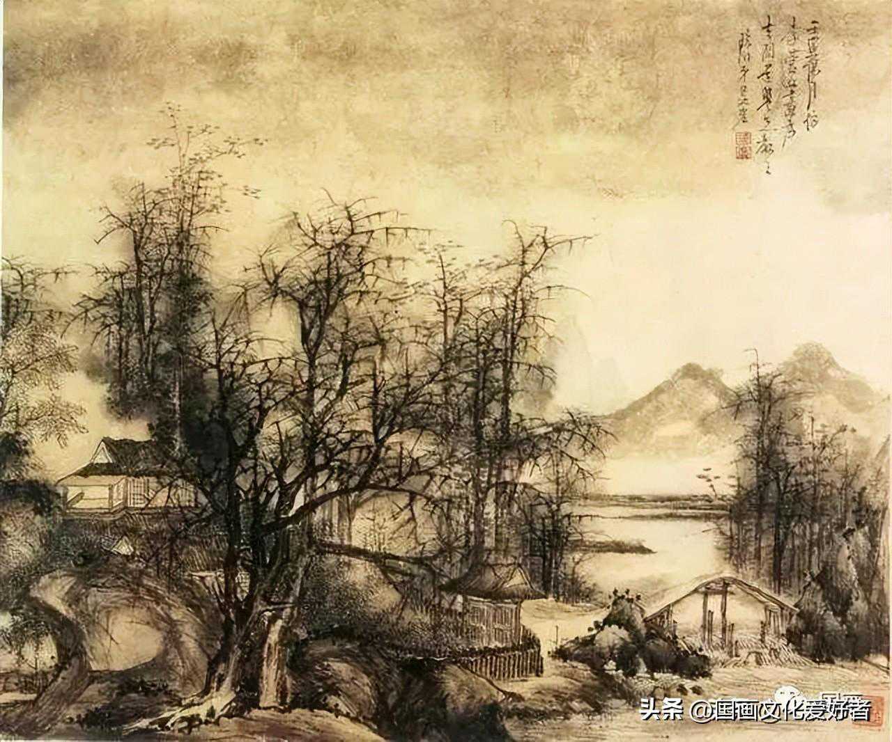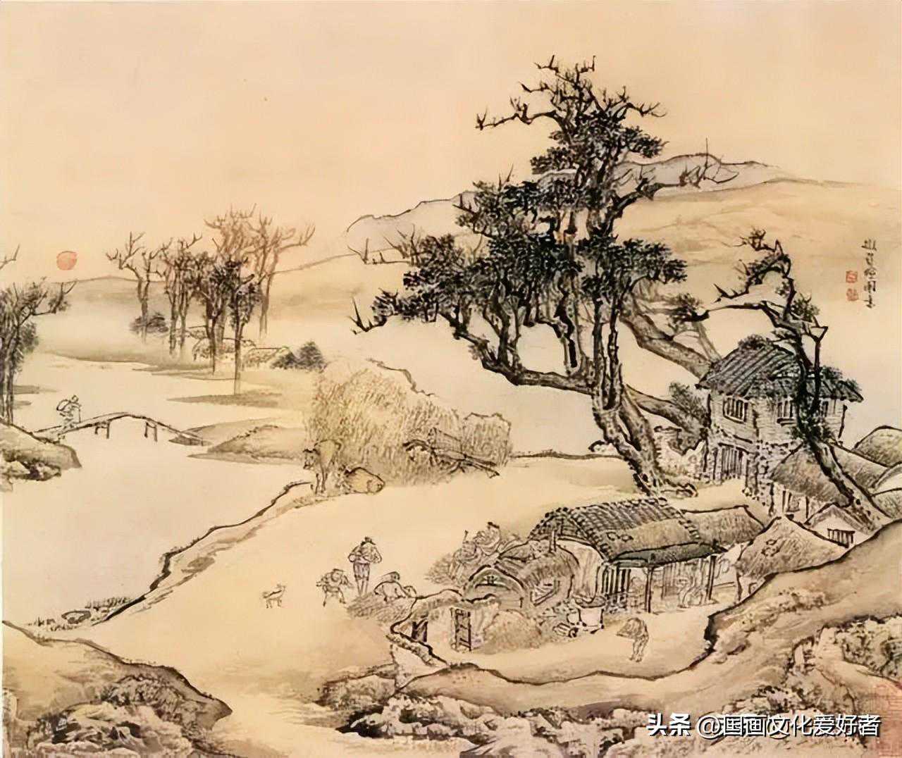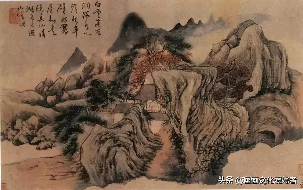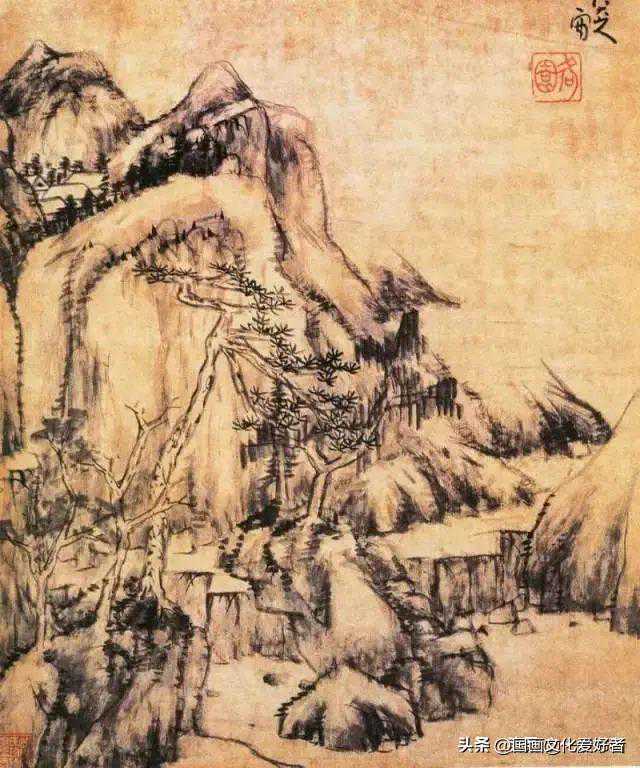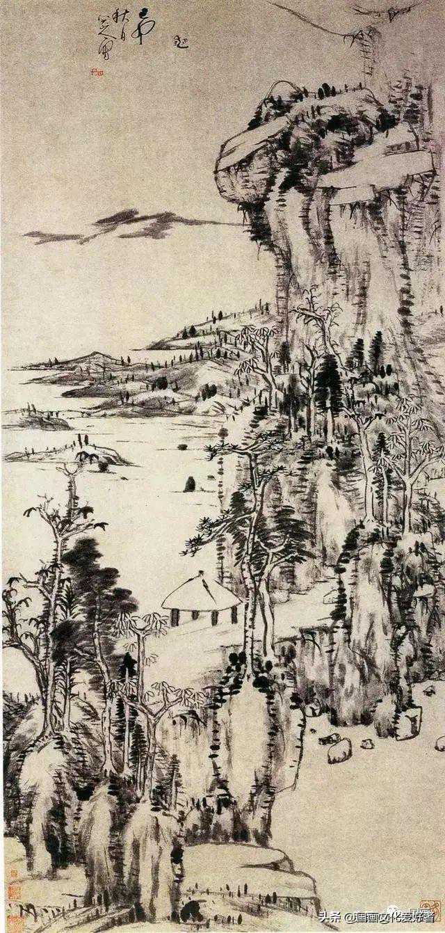 此图画山峦石壁,老树横枝,溪流人家。境界幽旷,用笔姿意,画面显得奔放苍健。