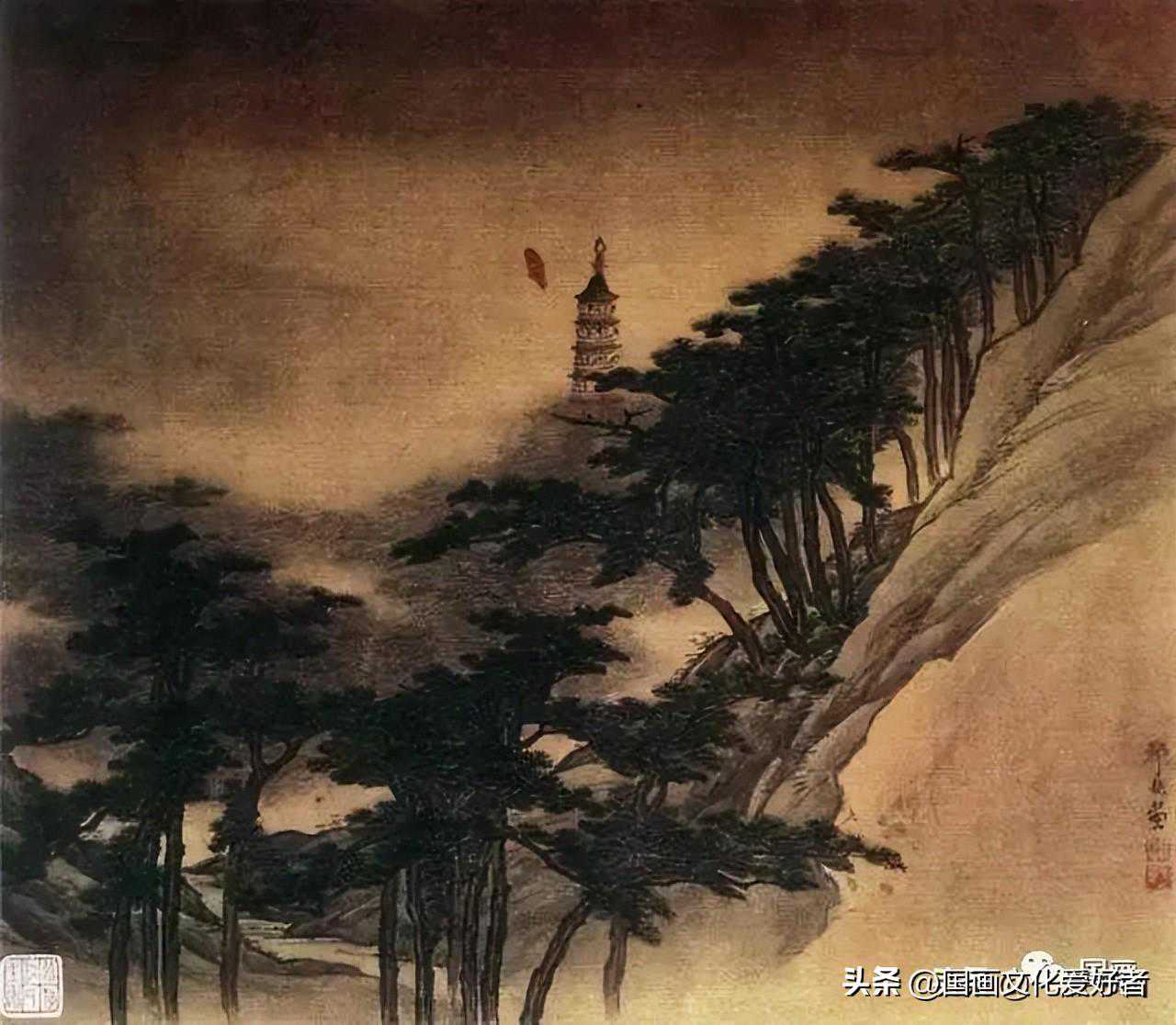两图为同一景,只是画家用不同的时间来描绘。图写山岭一角,丛林密树,林间曲径通幽,孤塔茅屋,掩映其间。笔墨粗健,色彩沉郁,凝重苍劲。