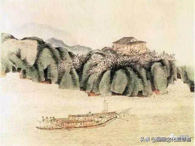 此图山石以粗笔勾勒轮廓,浓墨点苔,披麻、解索、折带皴相间,长皴、短斫交错,属沈周粗笔遗意。而其中树枝繁密的点叶,屋字细秀的用线,以及轻淡明雅的敷色,又有文徵明的意韵。画面点缀江上扁舟、潺流涧水,则添生动之气。